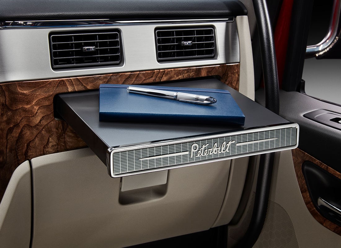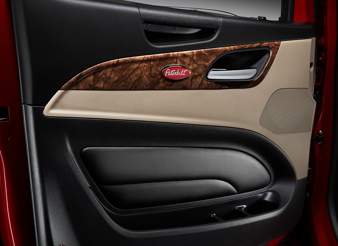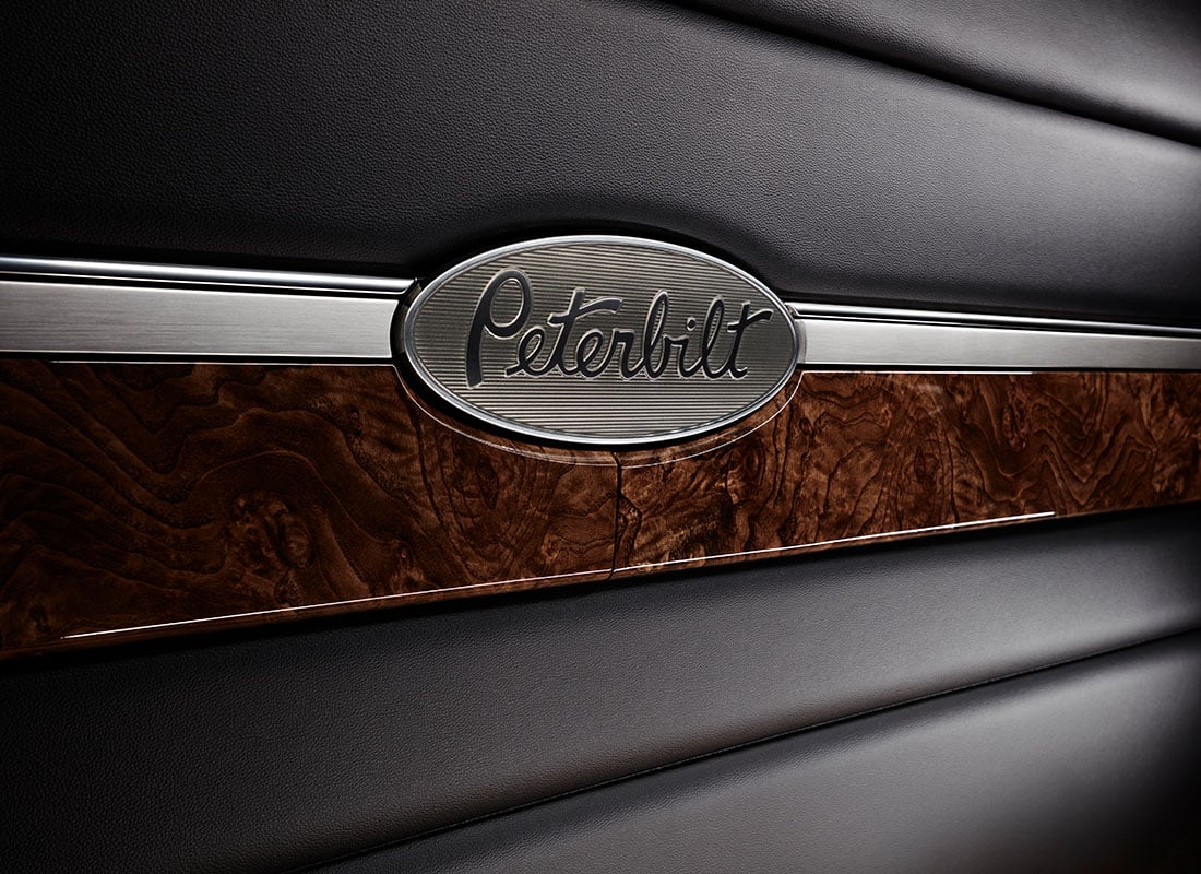 The Peterbilt Script & Spears is a bold and unique styling feature of the Model 589 Legendary Package. The Legendary Package features plenty of brightwork, including the fenders and rocker panels. The rectangular grille mesh and Peterbilt script and Spears are etched throughout the cab. Iconic Peterbilt style is well represented in the unique door pad design.