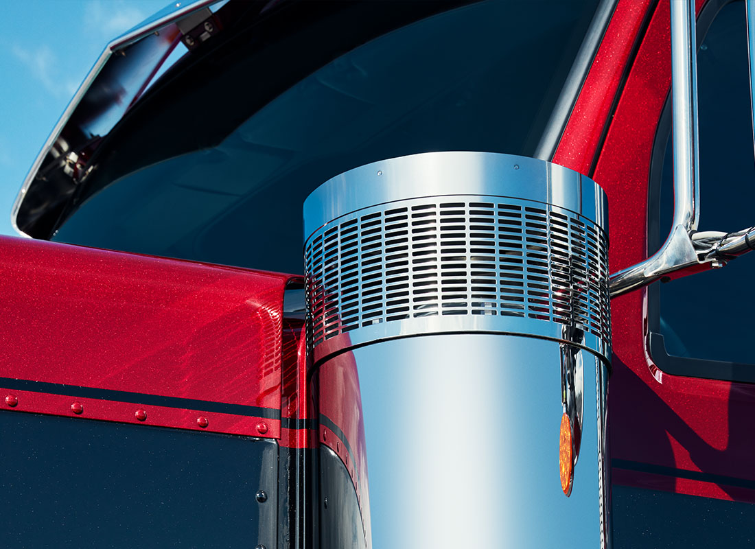 The Model 589 features classic Peterbilt styling, including design elements such as the huck-bolted aluminum hood, wrap-around grille crown with stainless steel grille, 15-inch external air cleaners, and 7-inch dual exhaust stacks. The wrap-around grille features the re-introduced rectangular mesh, which is carried over to the external air cleaners and exhaust shields.