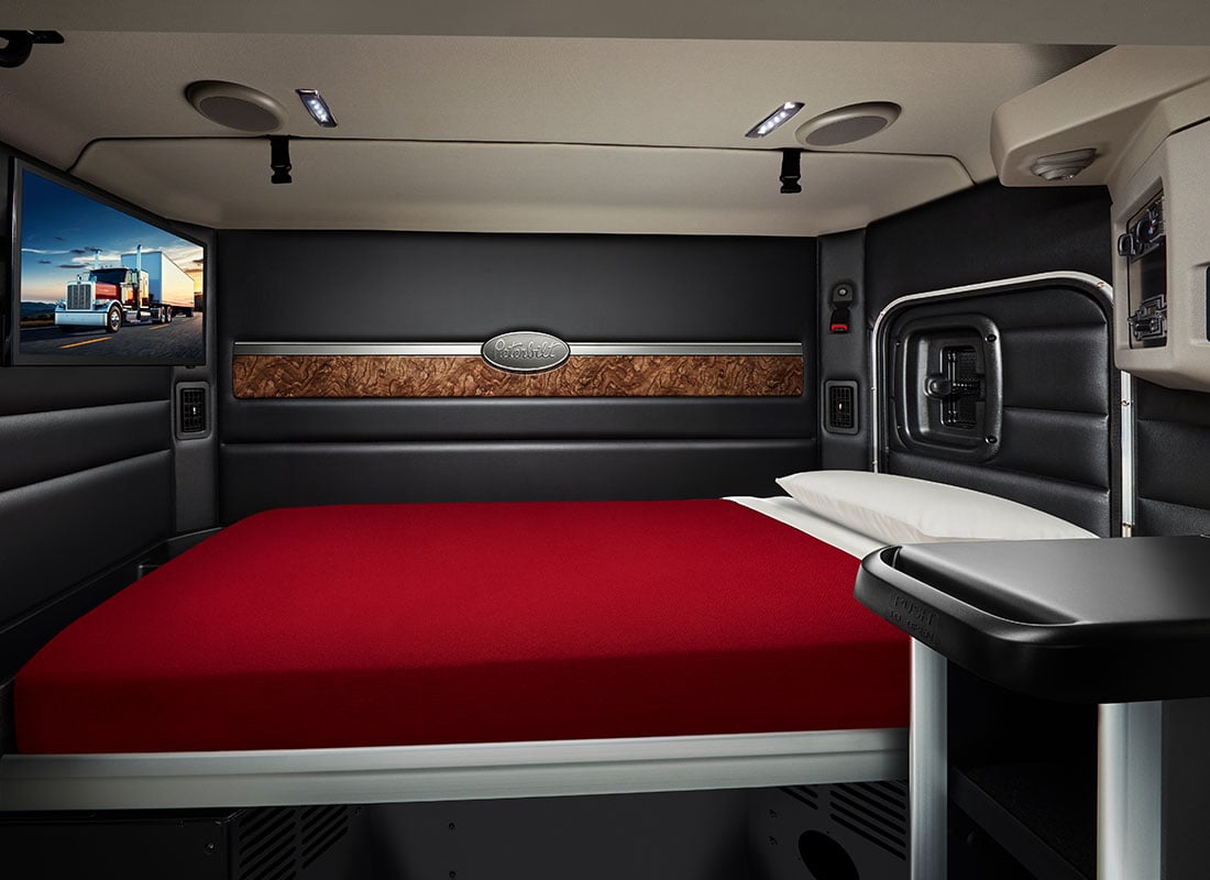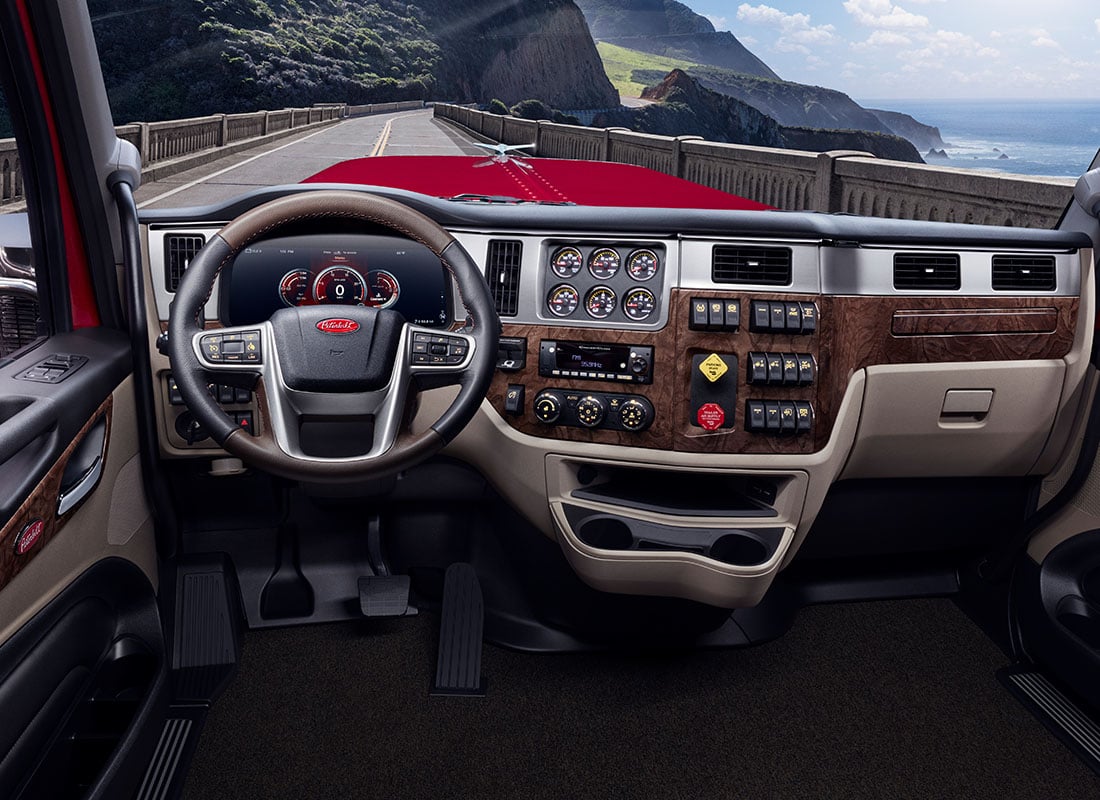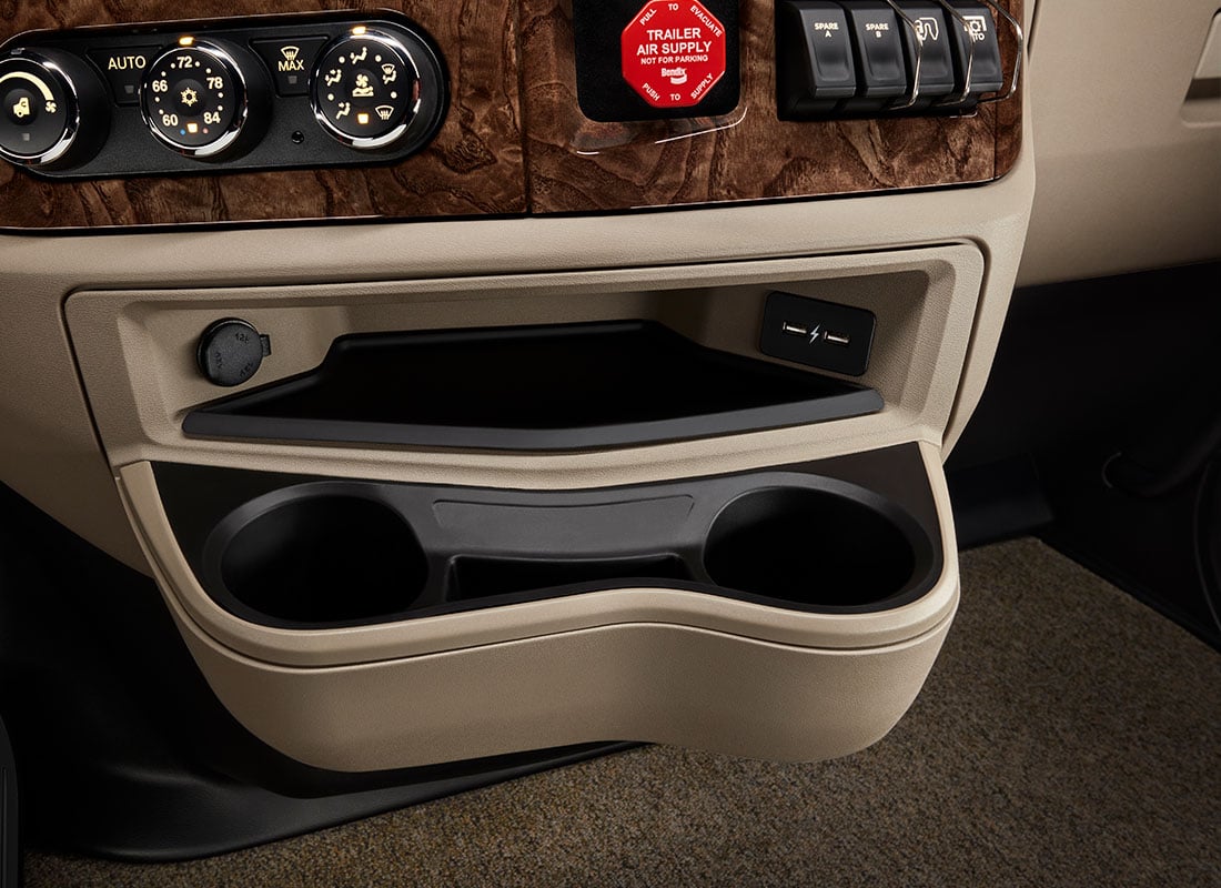 The interior of the Model 589 provides best-in-class quality and driver comfort. The Platinum trim features a rich burlwood grain dash and plentiful brightwork. The largest-in-industry 15-inch digital display is standard. Other driver-centric convenience features include larger cupholders and multiple USB chargers. Rich colours and materials abound throughout the interior. All interiors feature dark upper and kick panels that minimize glare. Sleepers feature contrasting panel with rich padding. The Platinum trim features a bold Peterbilt badge on the back wall.