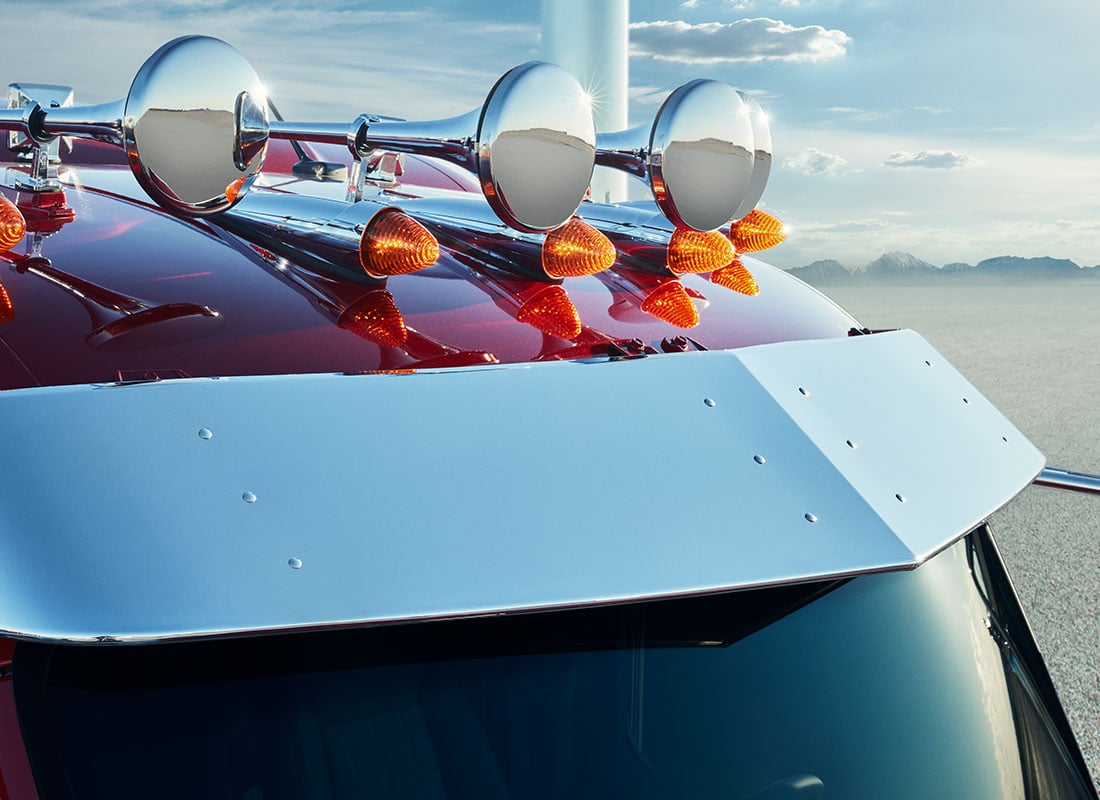The Model 589 features the iconic Peterbilt pod headlights. LED daytime running lights provide added visibility and safety for drivers. The v-style polished visor adds yet another bold element to the exterior of the truck. The West Coast-style mirrors maintain the traditional Peterbilt look while including enhanced features such as motorized and heated mirrors.