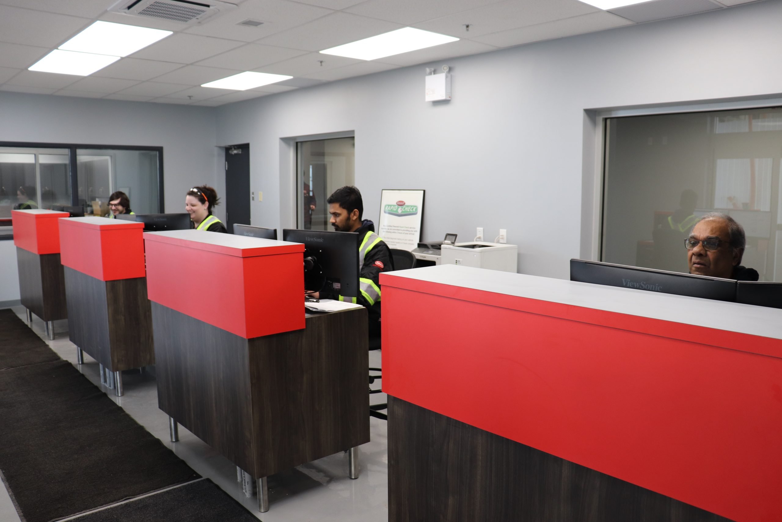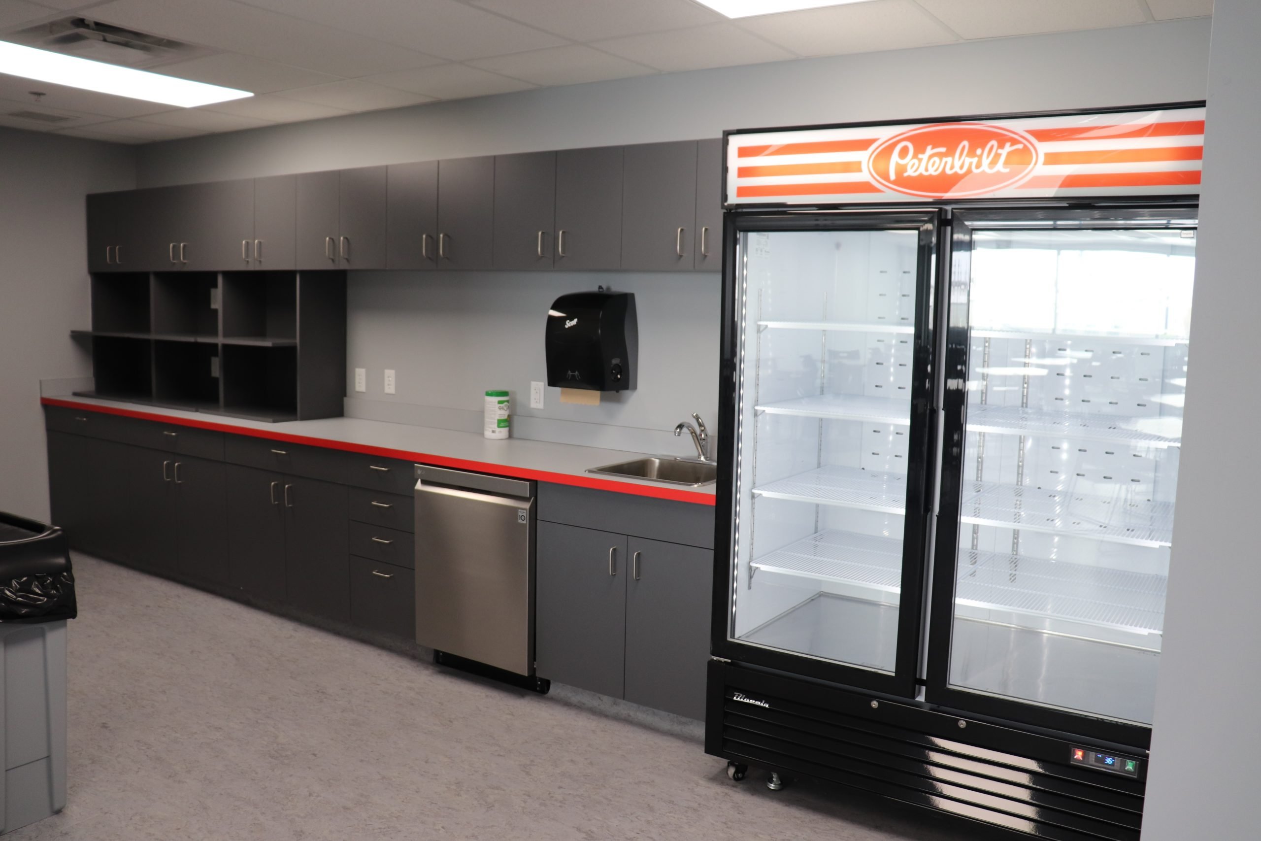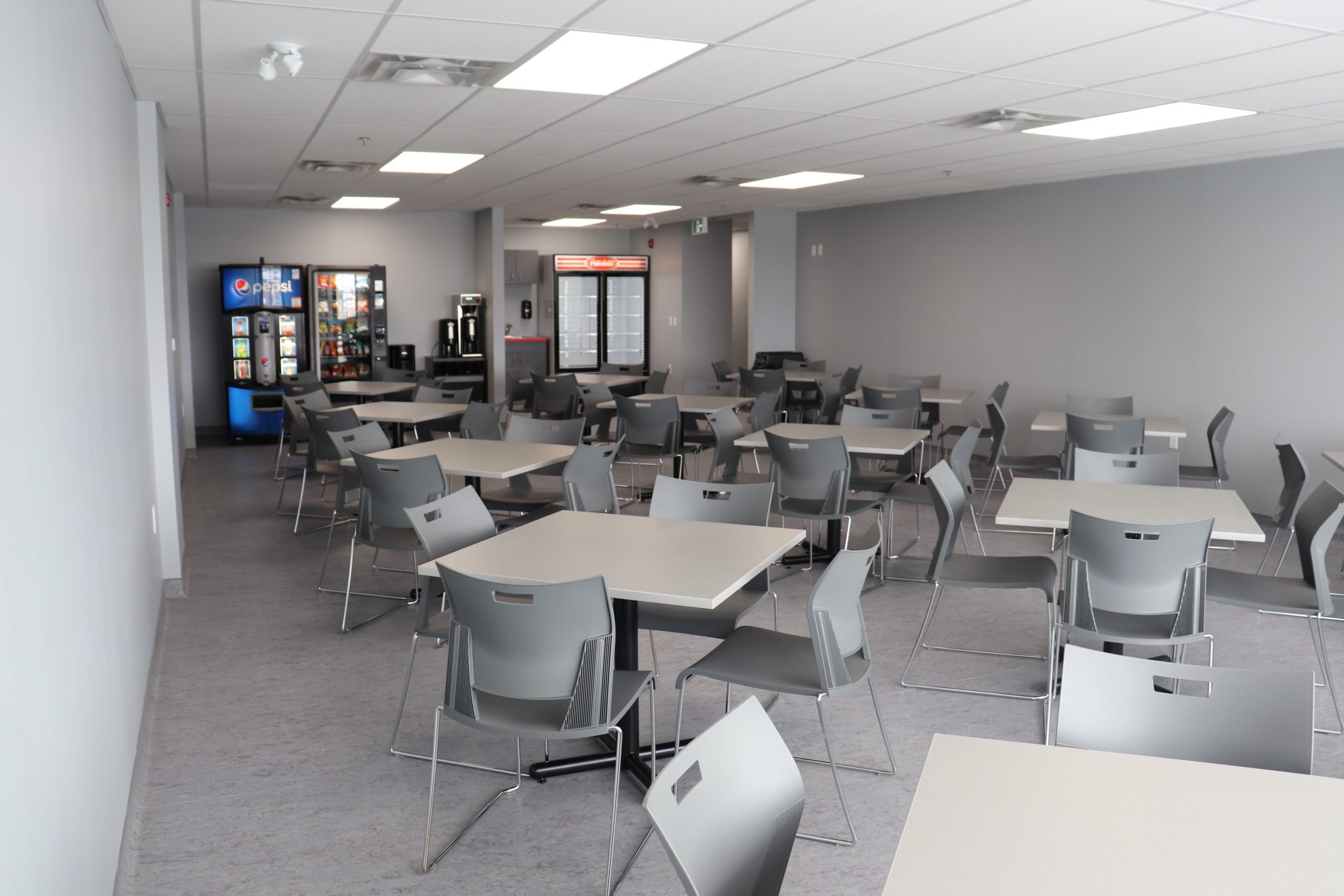 This expansion also added an upstairs technician area for our Service and Body Shop Technicians, which includes a lunchroom (with a 15-table/60-seat seating area, large fridge, dishwasher, 6 microwaves, vending machines, and coffee and water dispensers), double-tiered racking for coveralls, large 5-tap general sink, training room with 4 workstations, women's locker room/washroom/shower, men's locker room/washroom/shower.